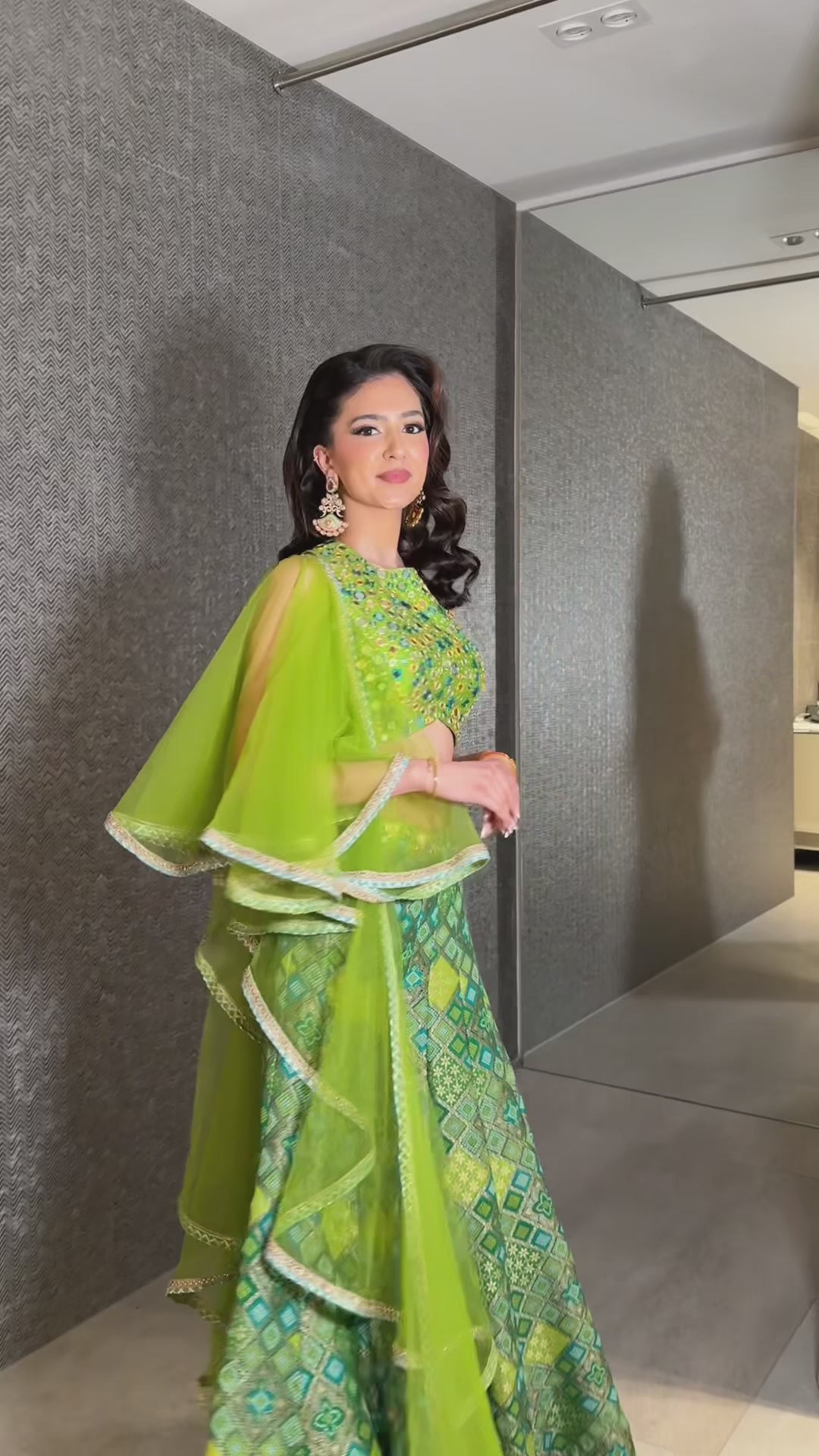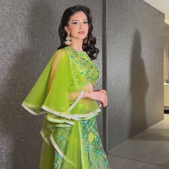 A refreshing blend of traditional elegance and youthful charm, this ensemble radiates festivity through its vibrant green hues and shimmering surface detailing. The flared sharara paired with a crew neck blouse offer a chic Indo-western silhouette, finished with a light dupatta that adds an airy finesse.