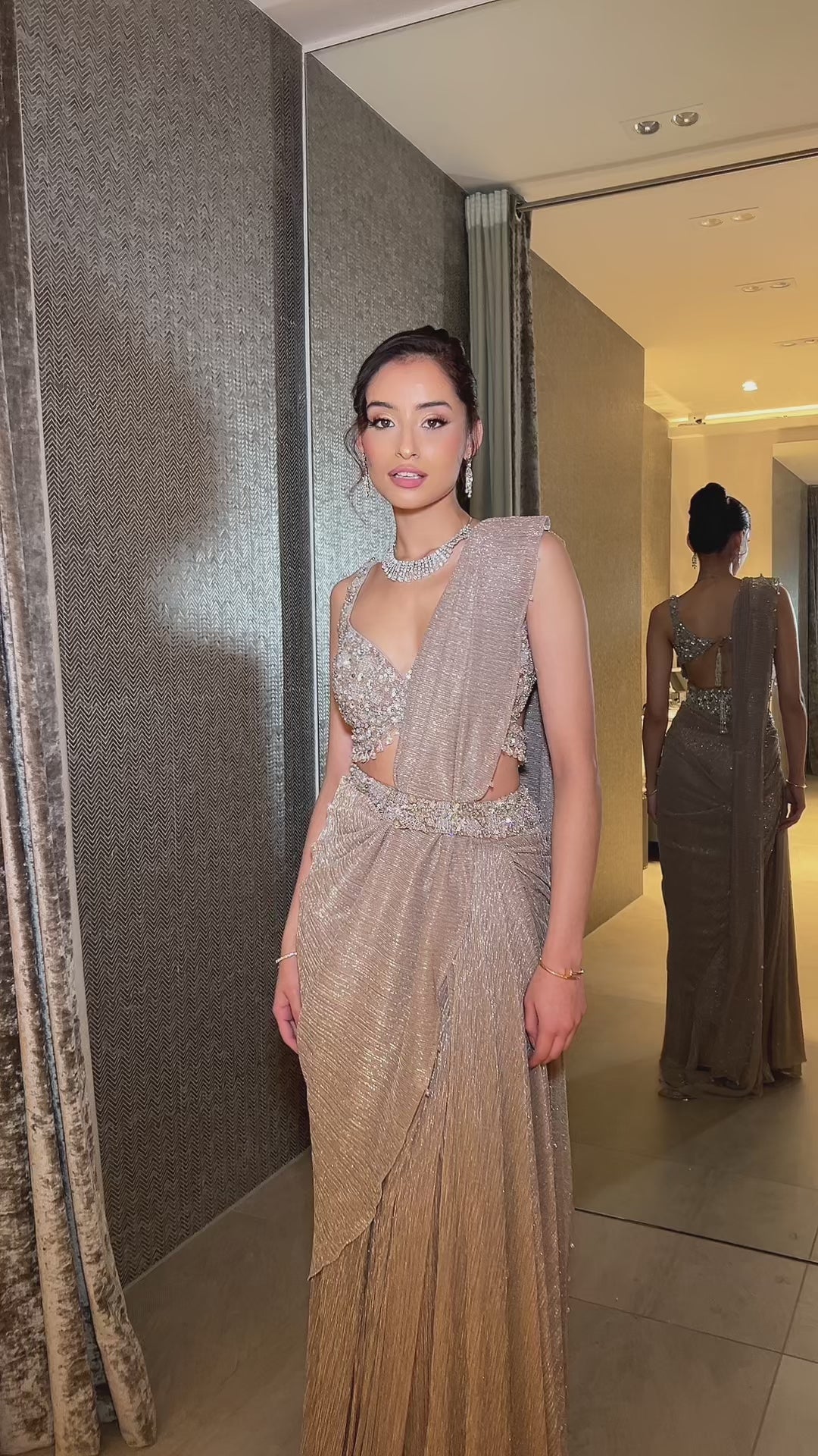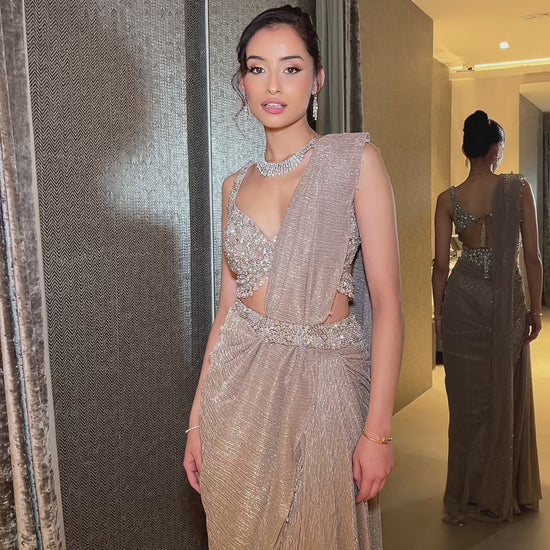 This ready-to-wear saree channels a modern, sculpted silhouette with a fluid drape and textural sheen. Its pre-draped pleats and structured blouse strike a balance between effortlessness and refined statement wear, ideal for cocktail evenings or chic festivities.