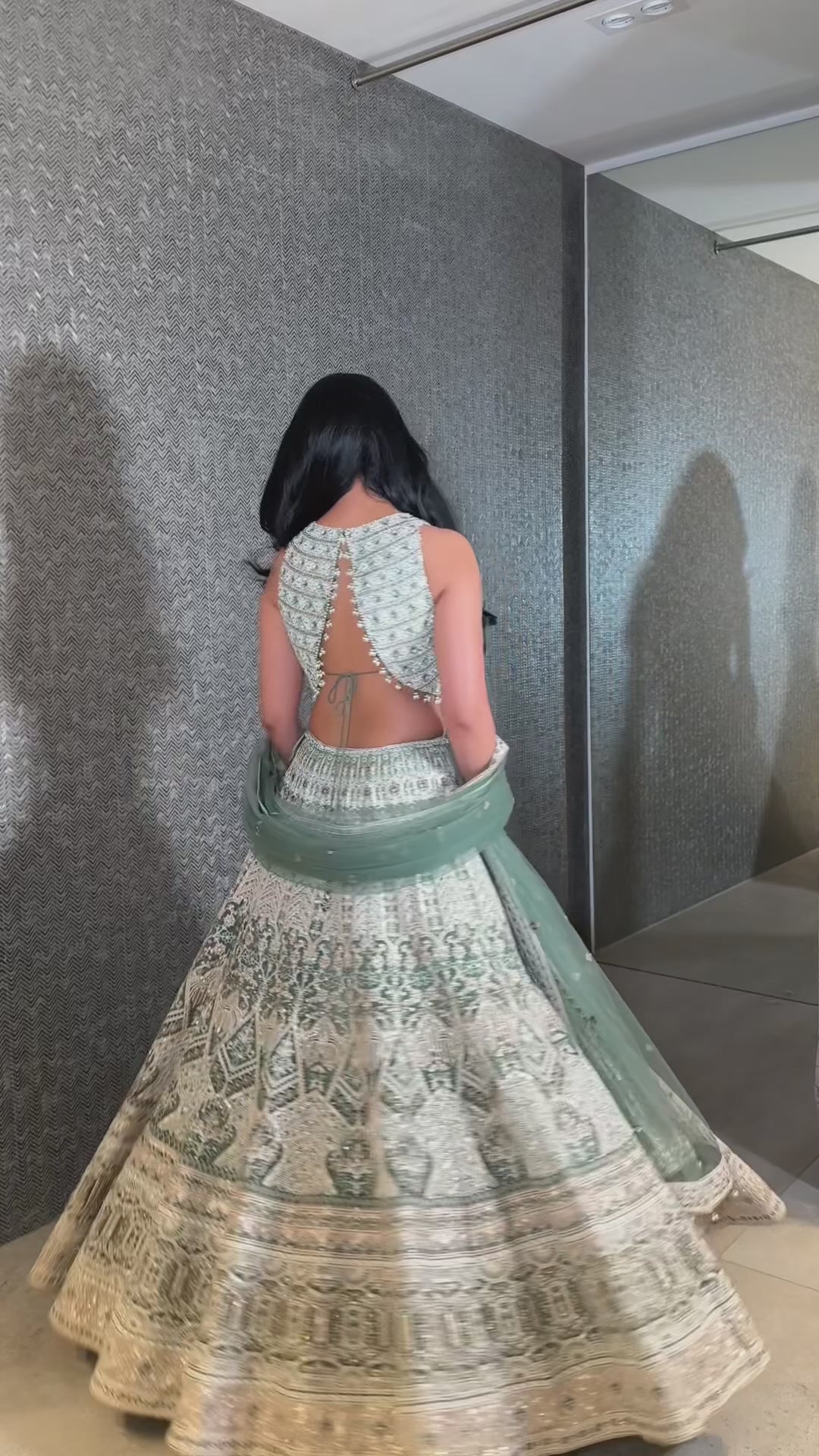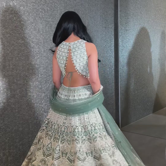 Sage Green Lengha with Pearl And Rose Gold Sequence Work