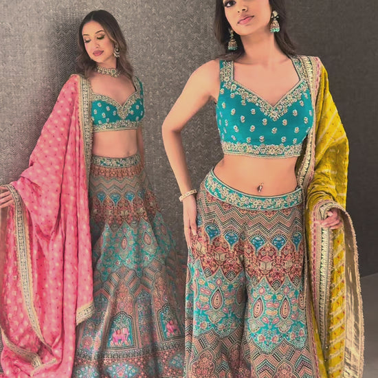 A vibrant ode to heritage craftsmanship, this Teal Heritage Sharara Set captures the richness of traditional artistry with a contemporary edge. Rendered in a deep teal hue, the ensemble features intricately detailed motifs in warm, earthy tones, elevated with fine zardozi work and subtle sequin accents. The structured blouse is paired with a gracefully flared Sharara, while the contrasting pink dupatta introduces a bold yet balanced pop of color. Thoughtfully designed, this set is perfect for wedding festivities, cultural gatherings, and statement celebrations.